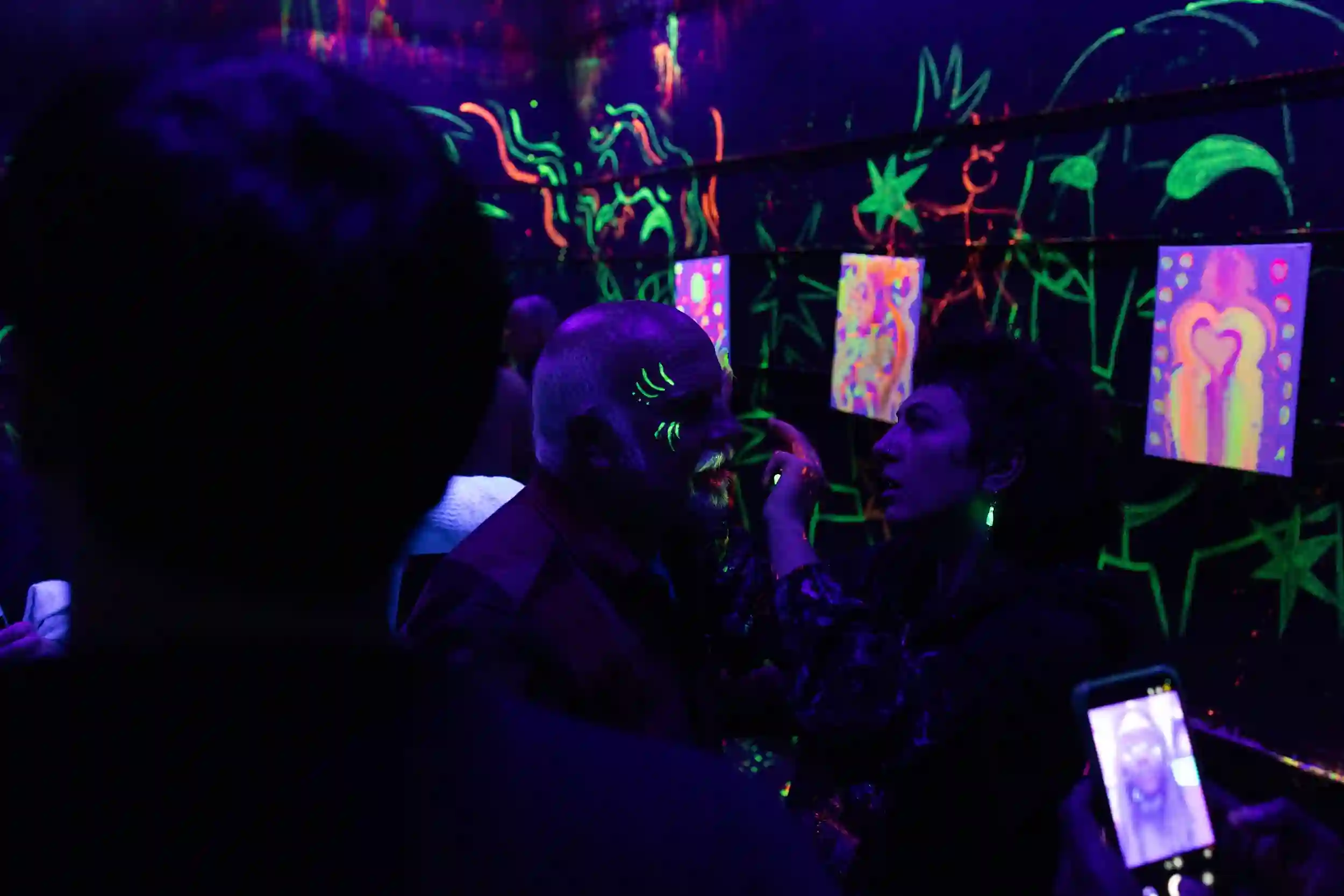 Session de peinture fluo immersive sur toile individuelle, avec option make up fluo ou création collective sur fresque géante.
